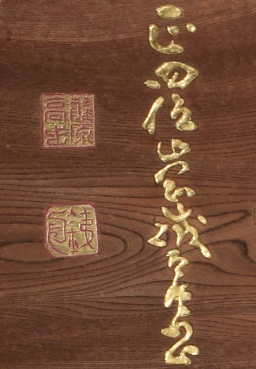 拡大写真は山門扁額の「正四位山岡鐵太郎書」「藤原高歩(ふじわらたかゆき)落款」「鉄舟(てっしゅう)落款」の部分と、閻魔堂扁額の「正四位山岡鐵太郎書」「山岡高歩(やまおかたかゆき)落款」「鉄舟居士(てっしゅうこじ)落款」の部分です。